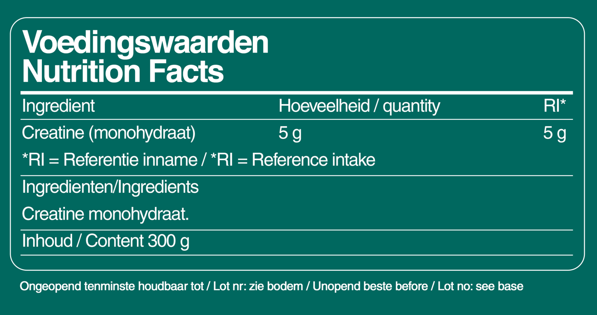 100% puur creatine monohydraat – 3g per scoop, 100 porties per pot. Geen smaak, geen toevoegingen, gewoon effectief en makkelijk te combineren.