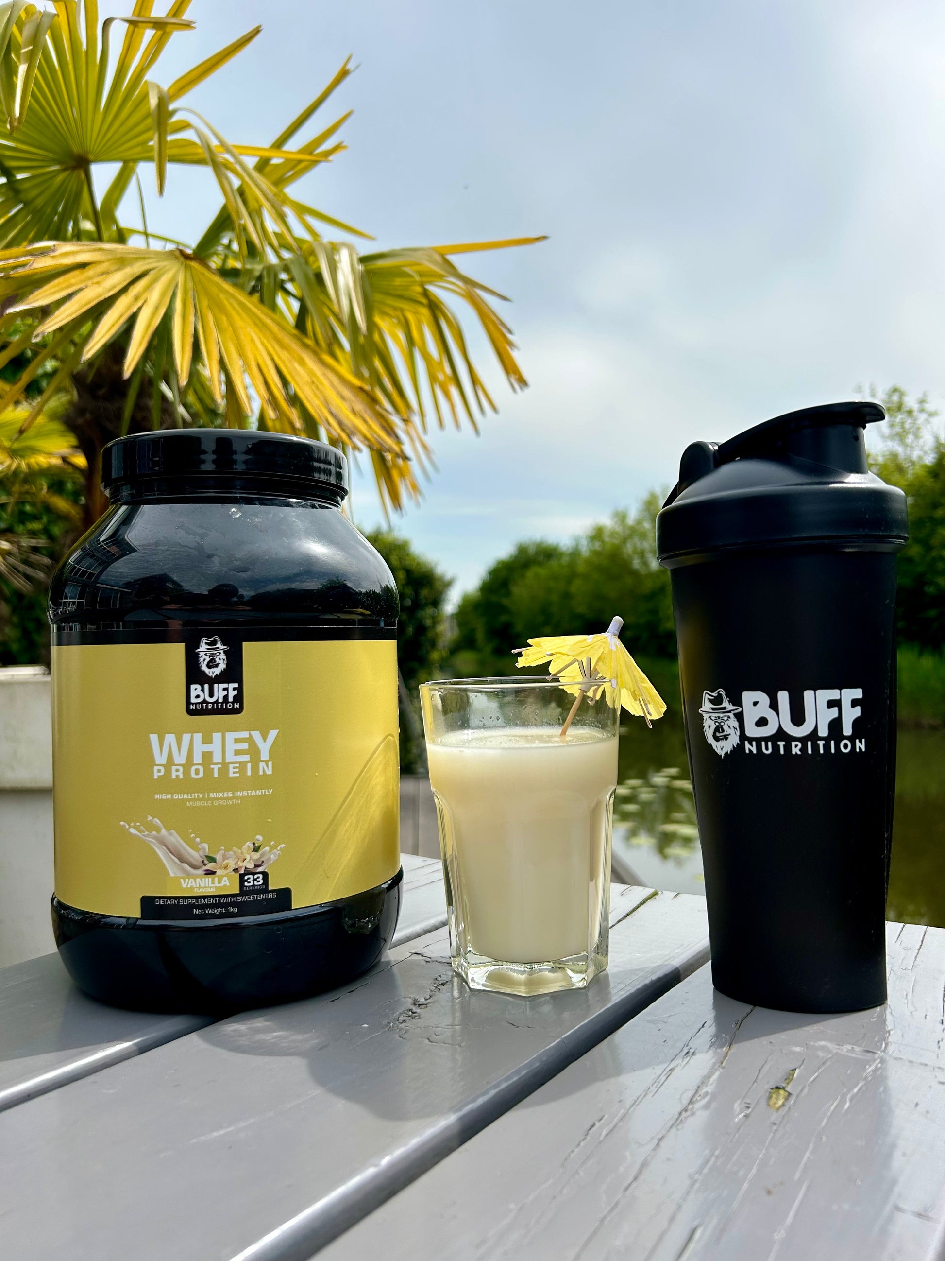 Meng 1 scoop (30 g) Buff Nutrition Whey Protein met 300 ml water in een shaker. Goed schudden en genieten! Perfect na je workout of als eiwitrijke snack.