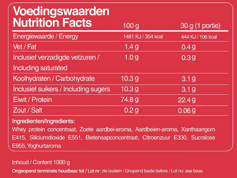 Ingredienten Whey protein Aardbei: Whey protein concentrate, Zoete aardbei-aroma, Aardbeien-aroma, Xanthaangom E415, Siliciumdioxide E551, Bietensapconcentraat, Citroenzuur E330, Sucralose E955, Yoghurtaroma.